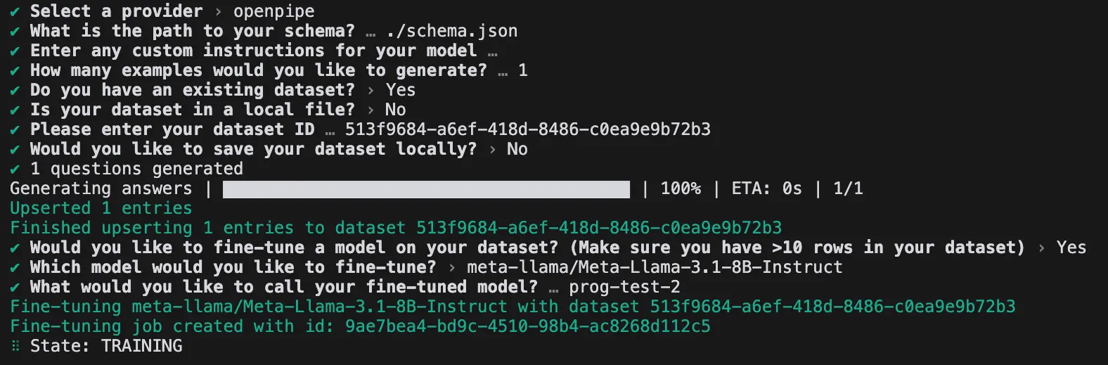Once all prompts are answered, new entries are generated and added to a new or existing dataset. Then, the user can specify whether they would like to fine-tune a model via the CLI, and if the answer is yes, the user can specify which model to fine-tune, and the FT status is shown in real-time. Finally, the new model slug is outputted to the user and can be used to make API calls.